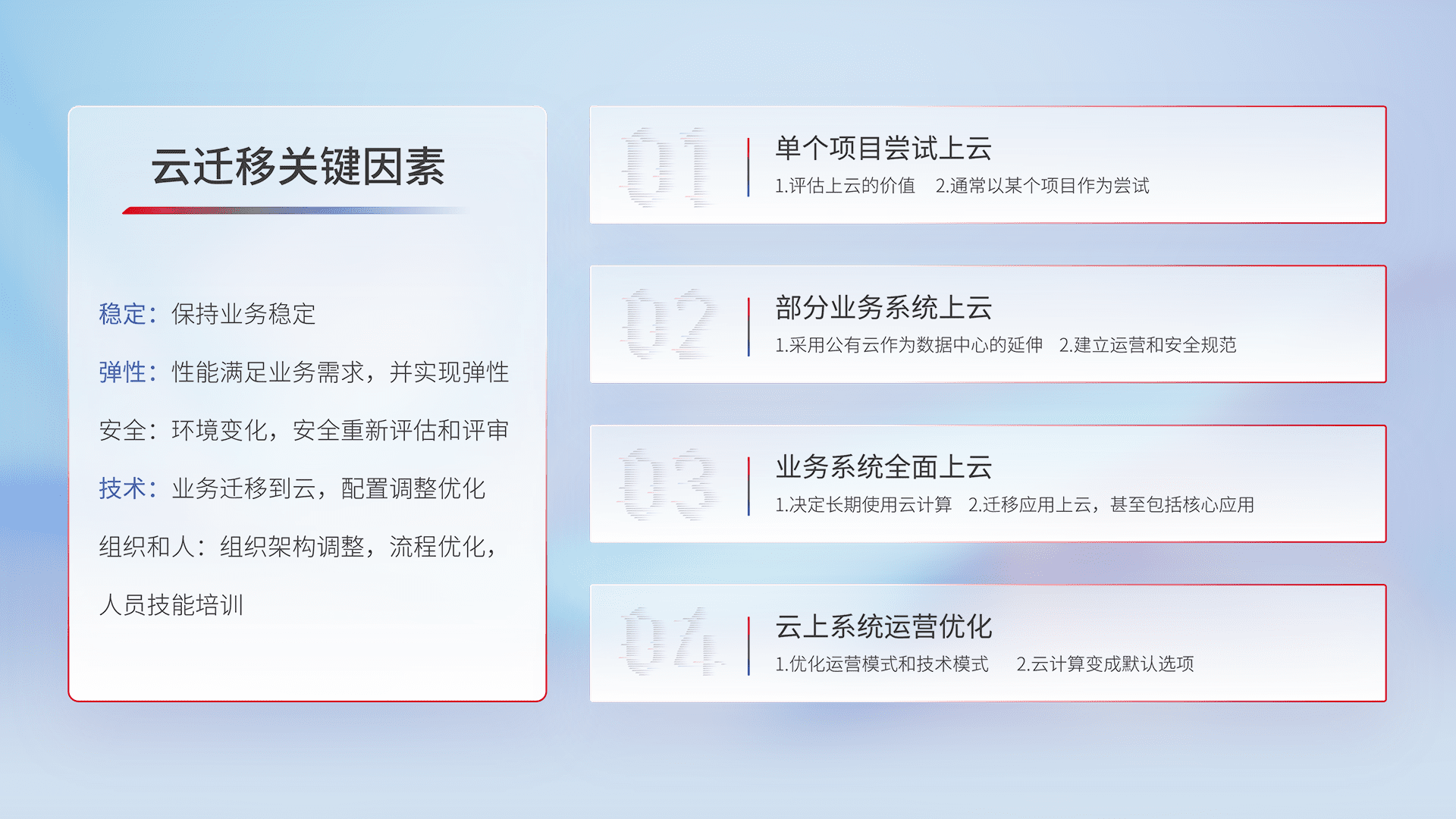 结合实际业务,,,从规划设计、、、、云平台选型、、、云原生改造、、、、数据迁移、、、、集成交付,,,迁移全过程为客户识别最佳上云路径,,,,做好风险识别管理,,设计网络架构、、身份权限、、、安全审计合规、、、、操作审计、、、日志审计、、监控告警策略、、、、多站点容灾设计等,,,,对云上基础设施进行整体规划,,,提升IT治理水平,,,以满足弹性、、、高可用、、高性能的需求。。