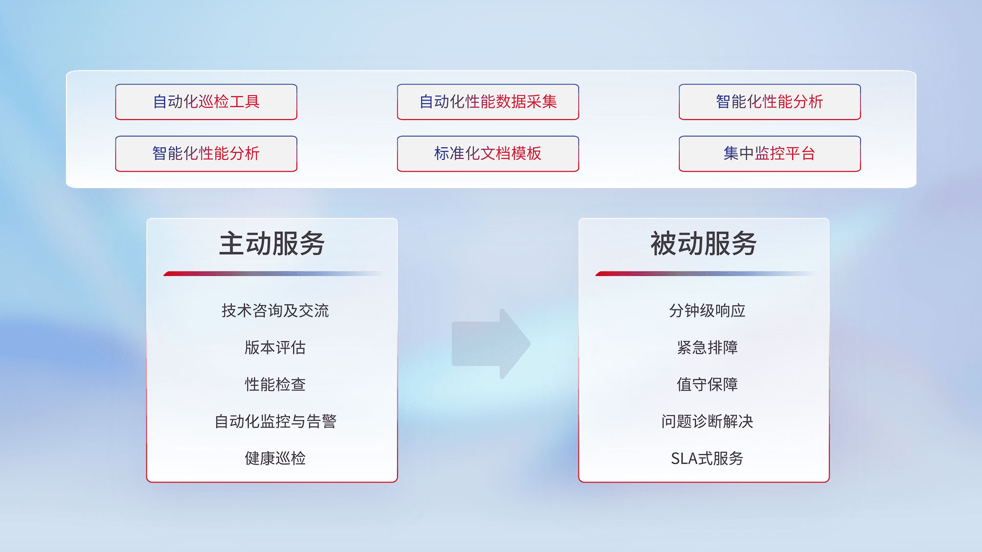 智能化工具和标准化文档,,,保障服务质量,,提供主动服务(包含技术咨询、、版本评估、、、性能检查、、、、自动化监控与告警、、、、健康巡检)和被动服务包含(分钟级响应、、紧急排障、、、值守保障、、、问题诊断解决、、、、SLA服务)。。。。